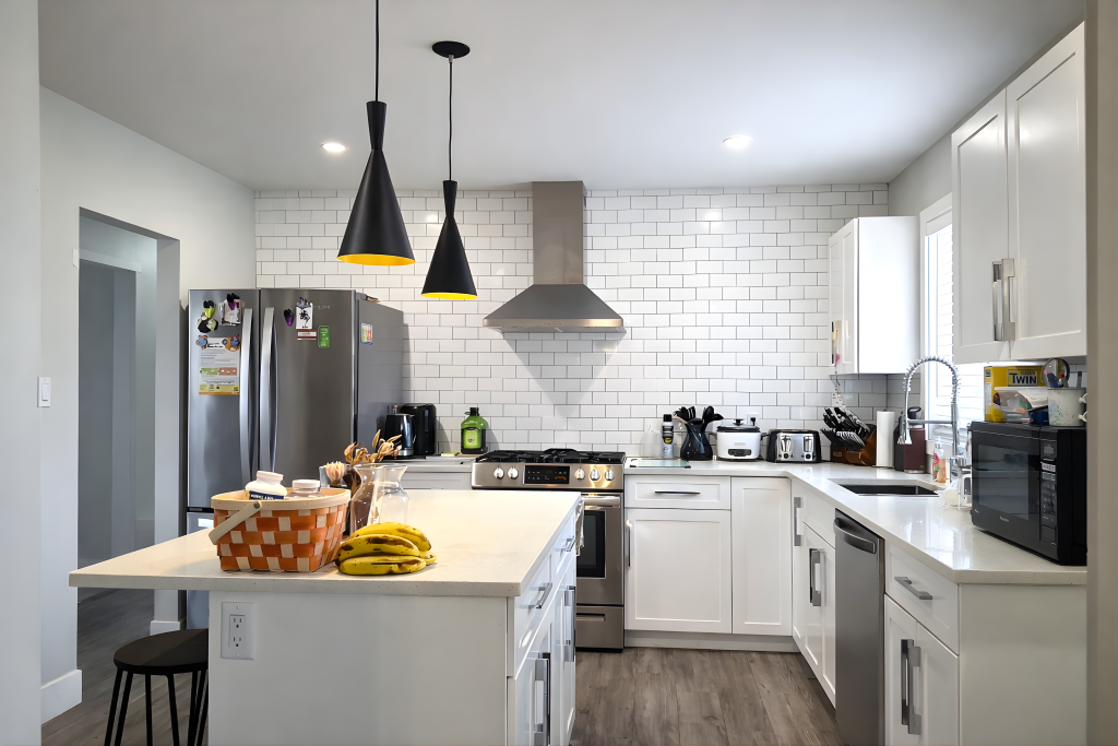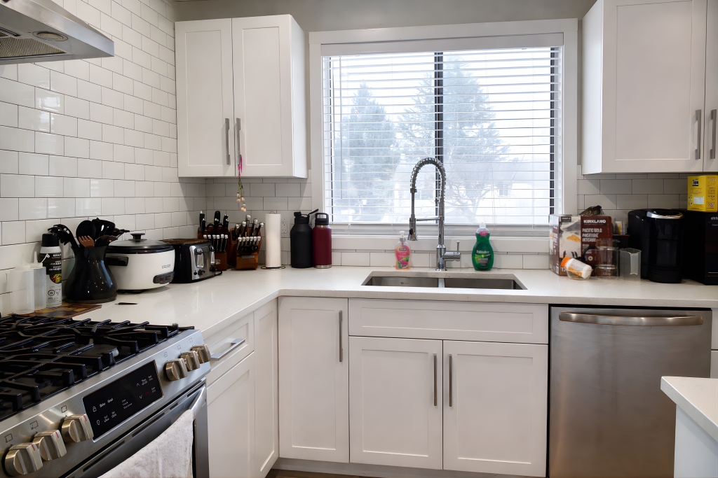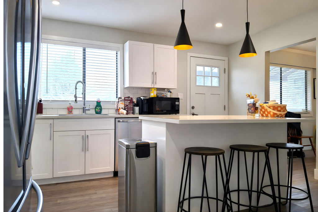 Large front windows under the roof peak makes for a distinguished living room space. An adjacent dining room leads to the splendid kitchen with bright contemporary shaker cabinets and an island topped with sparkling corean type countertops.