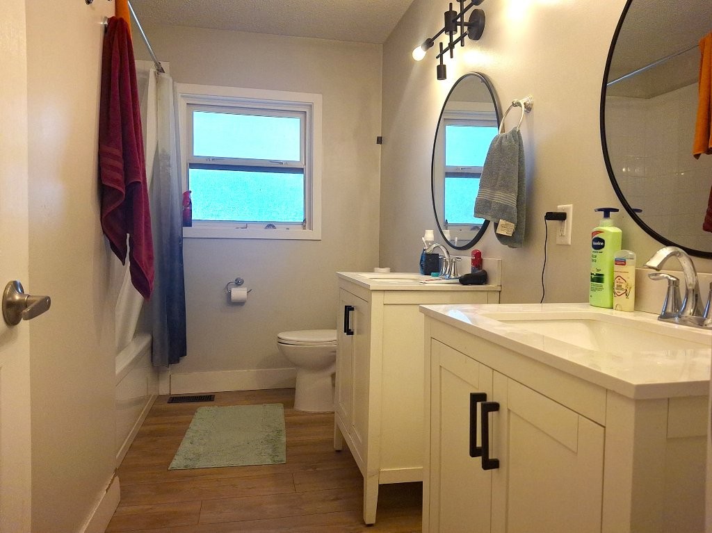 He and she sinks and mirrors, a tub/shower and sizable window make for a delightful bathroom close to the three well sized bedrooms. Sleek laminate floors connect it all together.