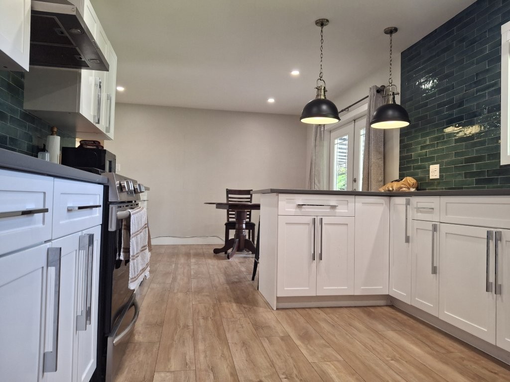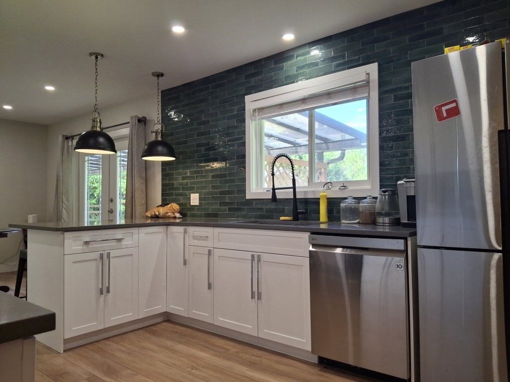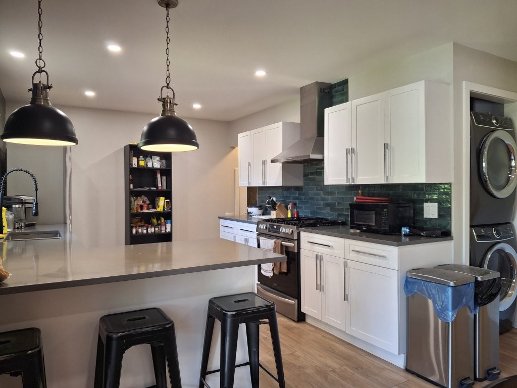 White shaker cabinets and shiny turquoise tiles give this kitchen a crisp, polished ambience. Abundant counter space and practical layout invite the culinarian to linger and create wonderful meals. A stackable washer and dryer cove is situated just around the corner.